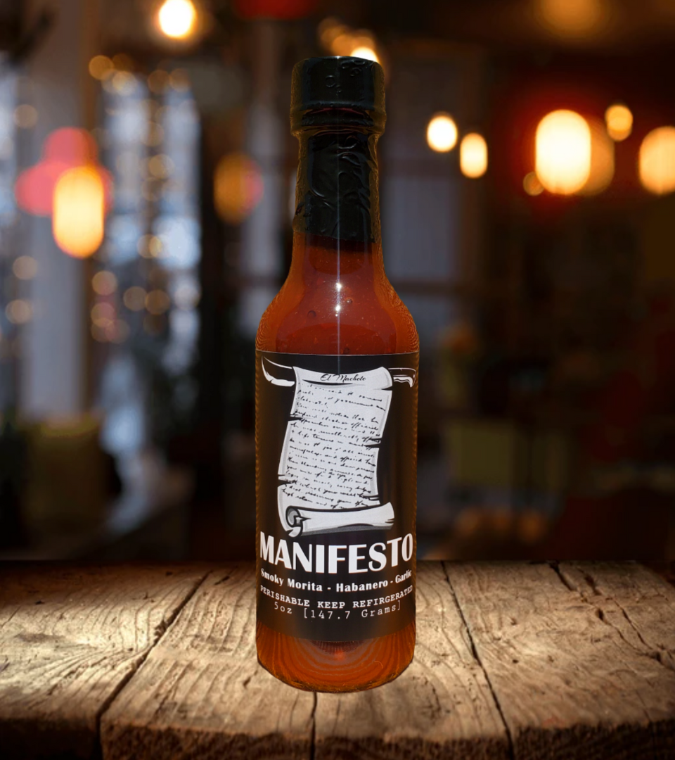 Manifesto is the first sauce created by the El Machete brand. This light, semi-sweet BBQ sauce character offers a savory, smoky, and tangy heat achieved by combining smoked Morita chillies, fire roasted Orange Habaneros, and toasted arbol chillies.